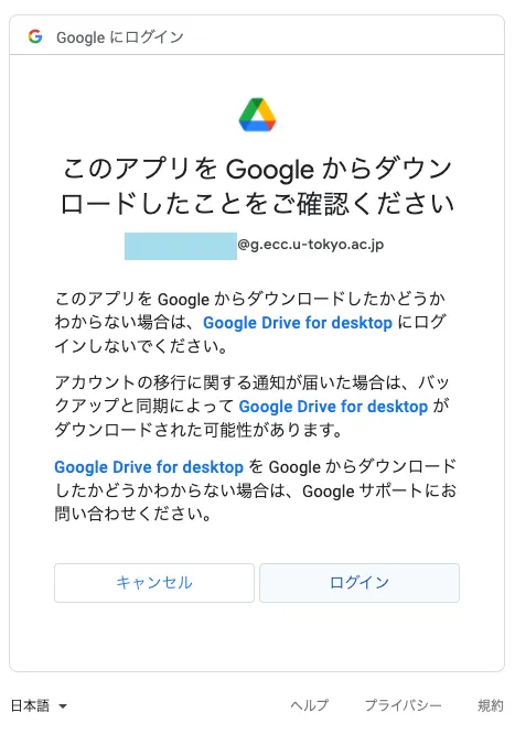 - 以下のウィンドウが表示されてGoogleドライブにログインできない場合は,Mac環境への再ログインをお試しください.