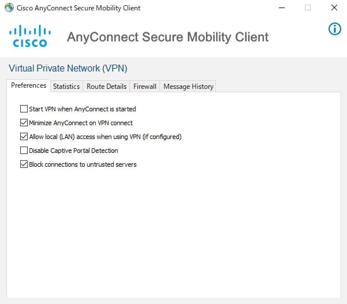 When you are connected to UTokyo VPN, the communication to the local network to which your computer is connected also goes through the VPN. Click the gear button on the bottom left of the AnyConnect Secure Mobility Client window. The following window will appear. In the “Preferences” tab of this window, check the “Allow local (LAN) access when using VPN (if configured)” check box.