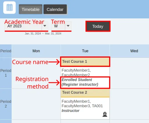 First, we will describe how to check your courses in the timetable and calendar format, and then how to view the course information as well as how to use the functions for assignments, handouts, and other materials (contents). Finally, this will explain how to list or search the contents of the courses you are taking and how to search for them.
