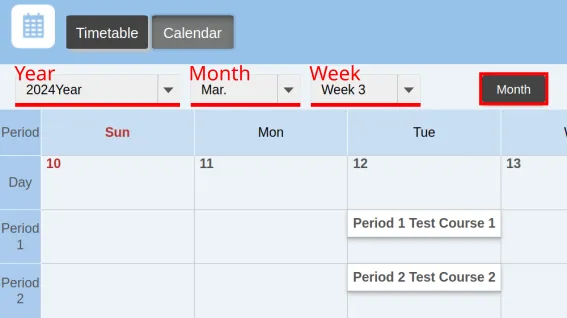 Courses can be displayed in a timetable or calendar format. You can switch between the two using the buttons at the top of the screen.