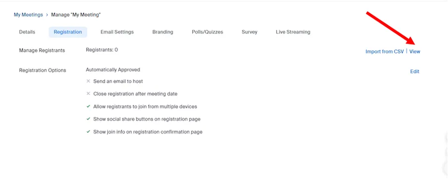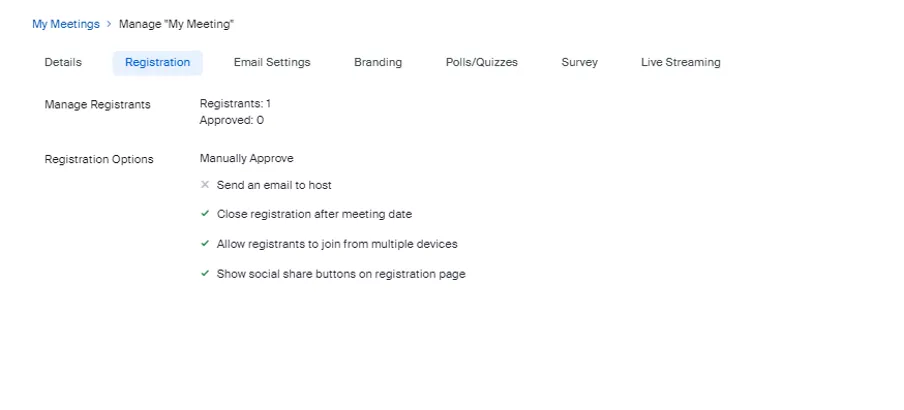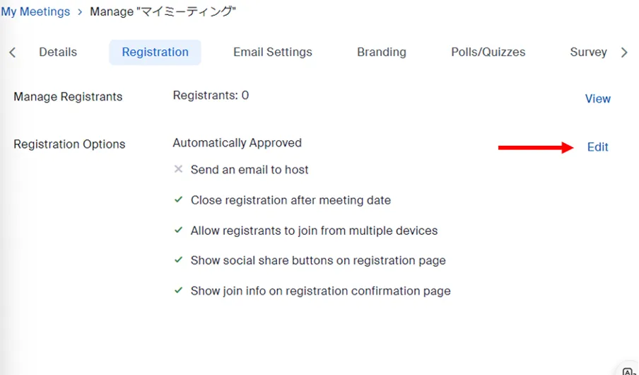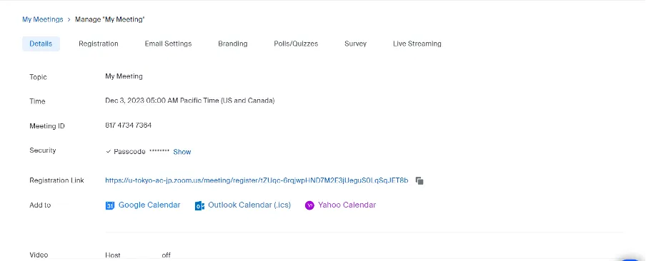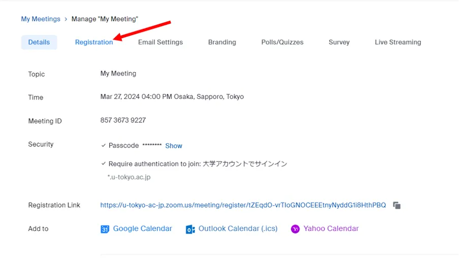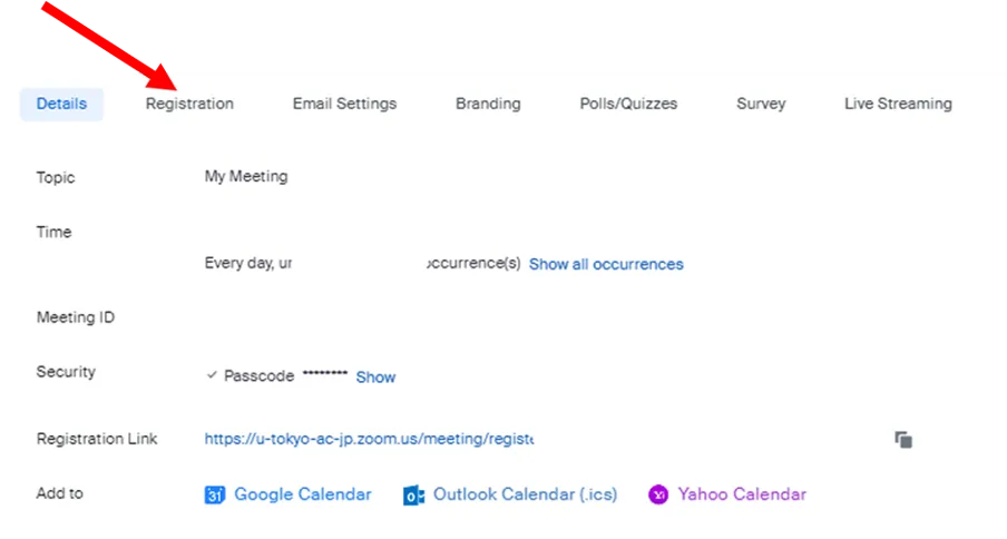 - The meeting information will be displayed. You will see a row of tabs at the top, such as “Registration”, “Email Settings”, etc. Please select the “Registration” tab.