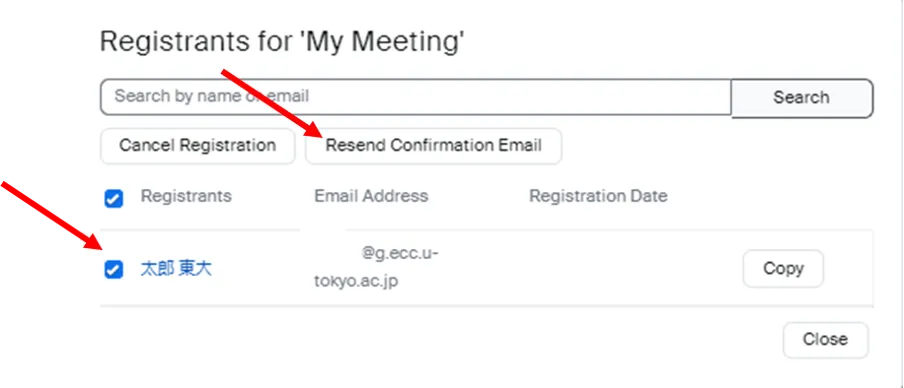 - Click on the checkbox for the registrant to whom you want to resend the confirmation email, and click on the “Resend Confirmation Email” button.