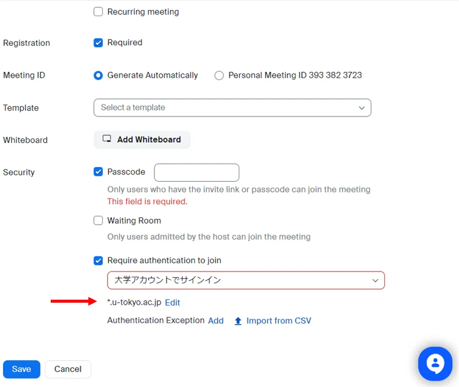 By setting so that only participants who have a UTokyo Account which have u-tokyo.ac.jp at the end, assigned to members of the University of Tokyo, can attend, you can restrict “Participant Registration” to UTokyo members only.