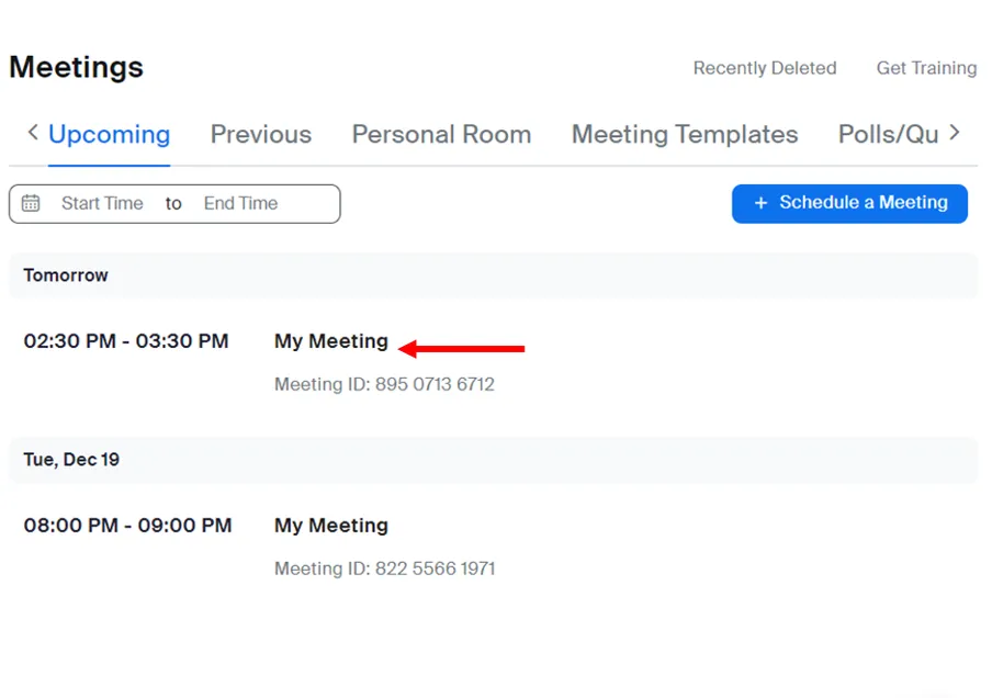 - Your scheduled meetings are displayed as a list. Please click on the name of the meeting for which you want to enable the manual approval option.