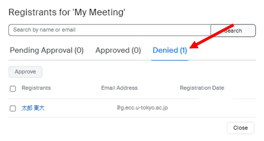 Here, we will explain how a host can deny the participation of a prospective participant who has completed the registration procedure. The denied prospective participants will receive a “Registration Denial Email” indicating that their participation has been denied, rather than a confirmation email with the join link.