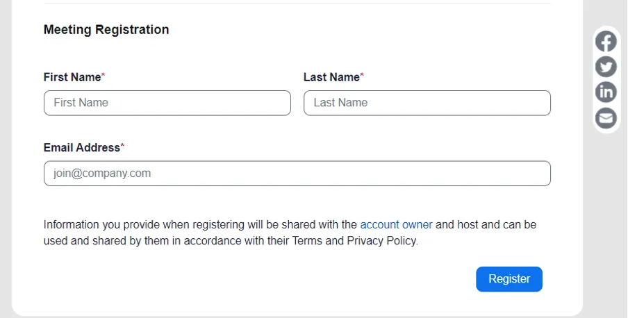 The meeting host creates a registration link using this feature. Subsequently, the host sends the relevant link to prospective participants and asks them to complete the registration procedure. Prospective participants who wish to attend the meeting are required to access the registration page provided by the host and complete the registration procedure. Prospective participants who register are automatically approved to join the meeting on completing the procedure and receive a confirmation email containing an individualised link. It is not possible to join the meeting unless you complete the registration process and obtain the link.