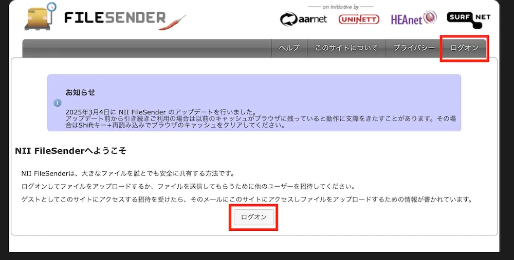1. NII FileSenderのアップロードページにアクセスしてください.