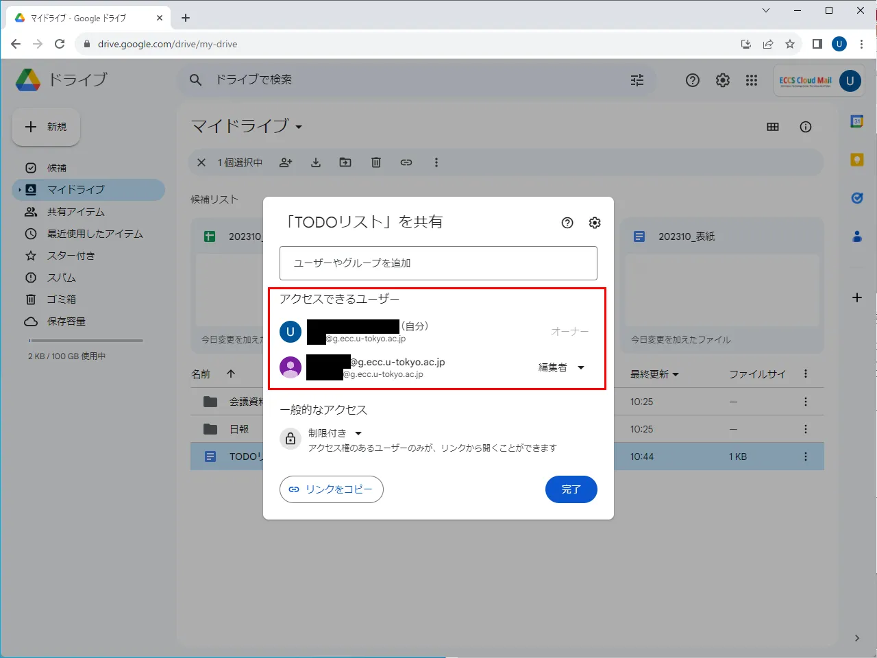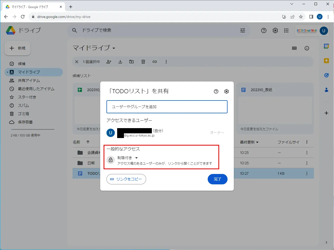• 誰でもアクセスできるようにする設定と,東京大学のECCSクラウドメールのアカウントを持っている人に限り誰でもアクセスできるようにする(ECCSクラウドメールのアカウントを持っていない人を除外する)設定の,2つの設定が可能です.
