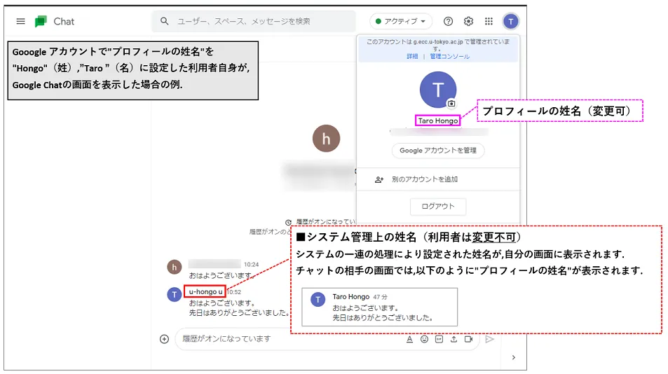 • Google Chatを利用する際や,ファイルやGoogleカレンダーの共有を行う場合に,相手に通知される姓名です.