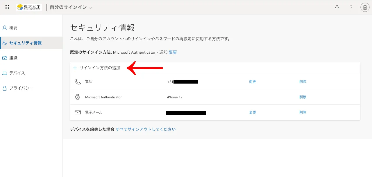 - 「サインイン方法の追加」を押してください.