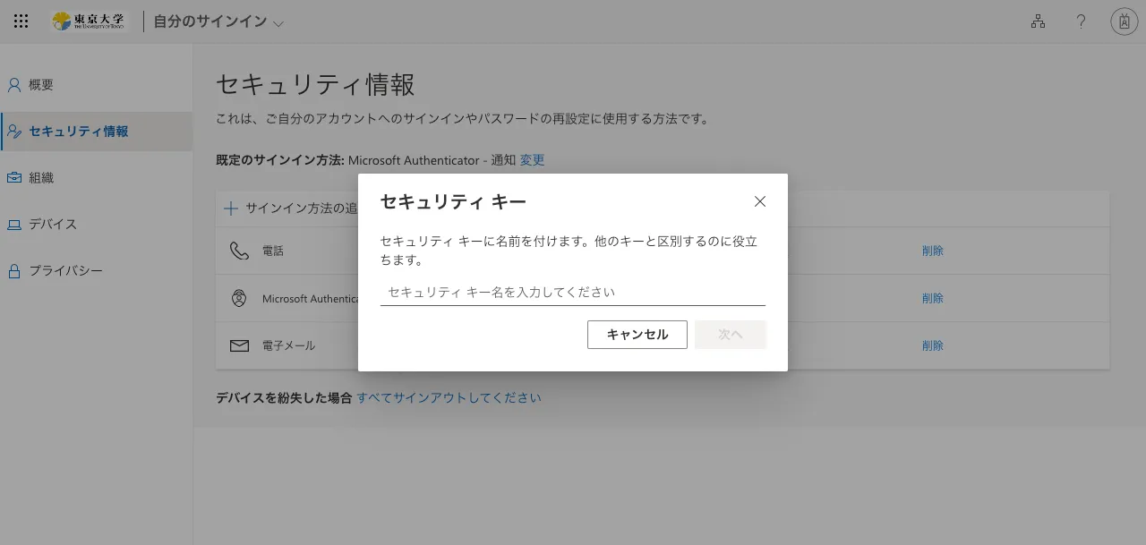FIDOセキュリティキーは,2個目以降の本人確認方法として登録することを前提としています.多要素認証を初めて利用する方は,「UTokyo Account多要素認証の初期設定手順」の中の「手順1:1個目の本人確認方法を登録する」の手順に従って1個目の本人確認方法を登録してから,追加の本人確認方法としてFIDOセキュリティキーを登録してください.