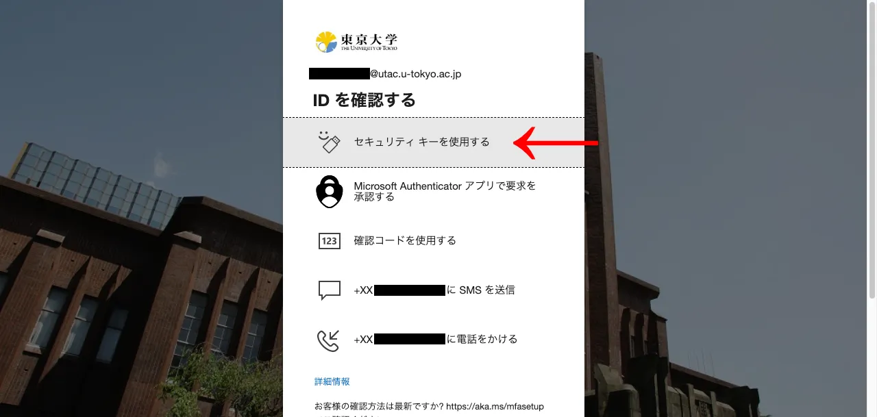 - 別の本人確認方法を選択する画面が表示されるので,「セキュリティ キーを使用する」を押してください.