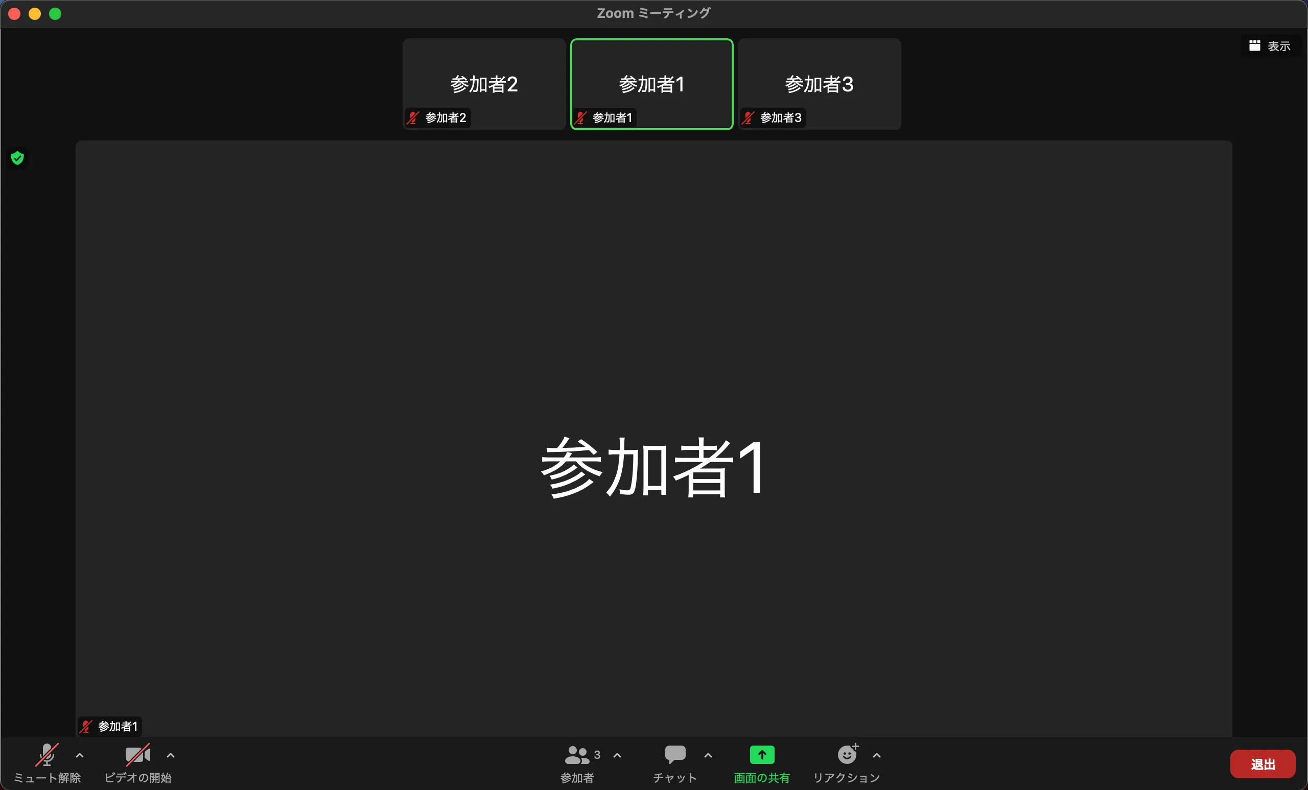 画面共有が行われていない場合,デフォルトでは発言中の参加者を大きく表示するスピーカービューという表示になっています.スピーカービューでは,発言者が変わると大きく表示される参加者が自動的に切り替わります.