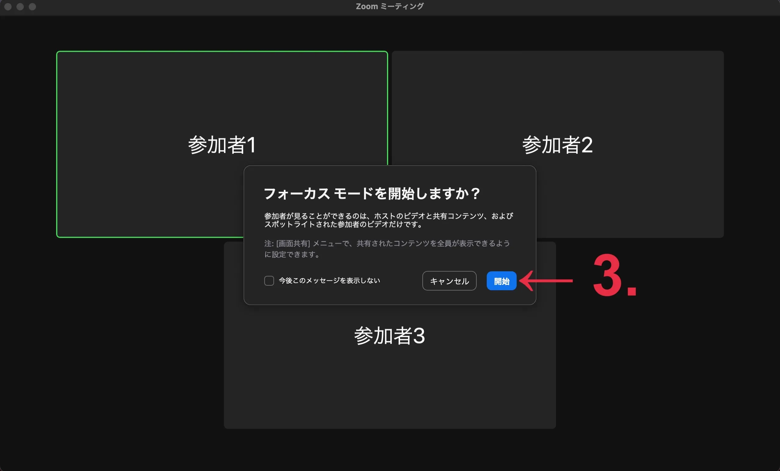 - 「フォーカスモードを開始しますか?」というメッセージが表示されたら,「開始」をクリックして確定するか,「今後このメッセージを通知しない」というチェックボックスをオンにして,今後この確認プロセスをスキップします.